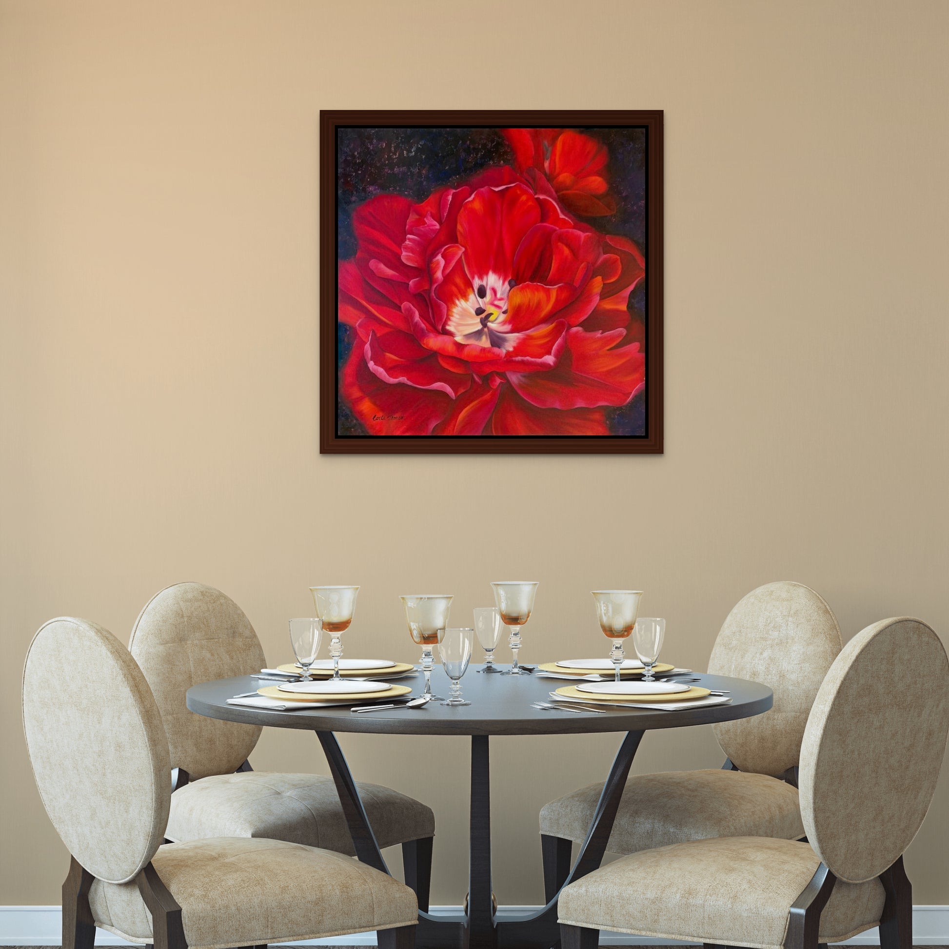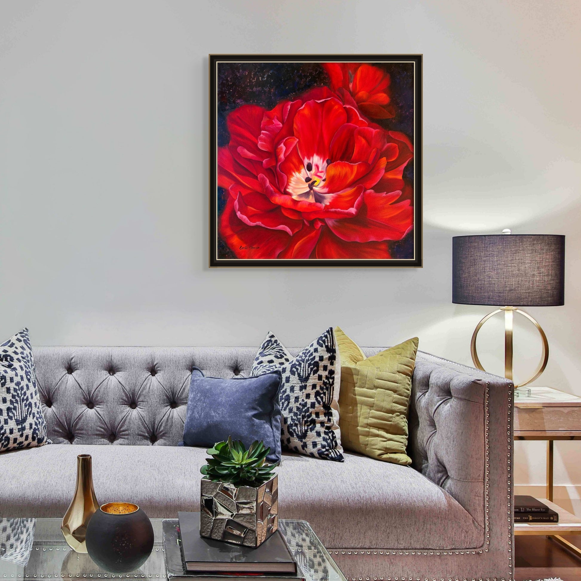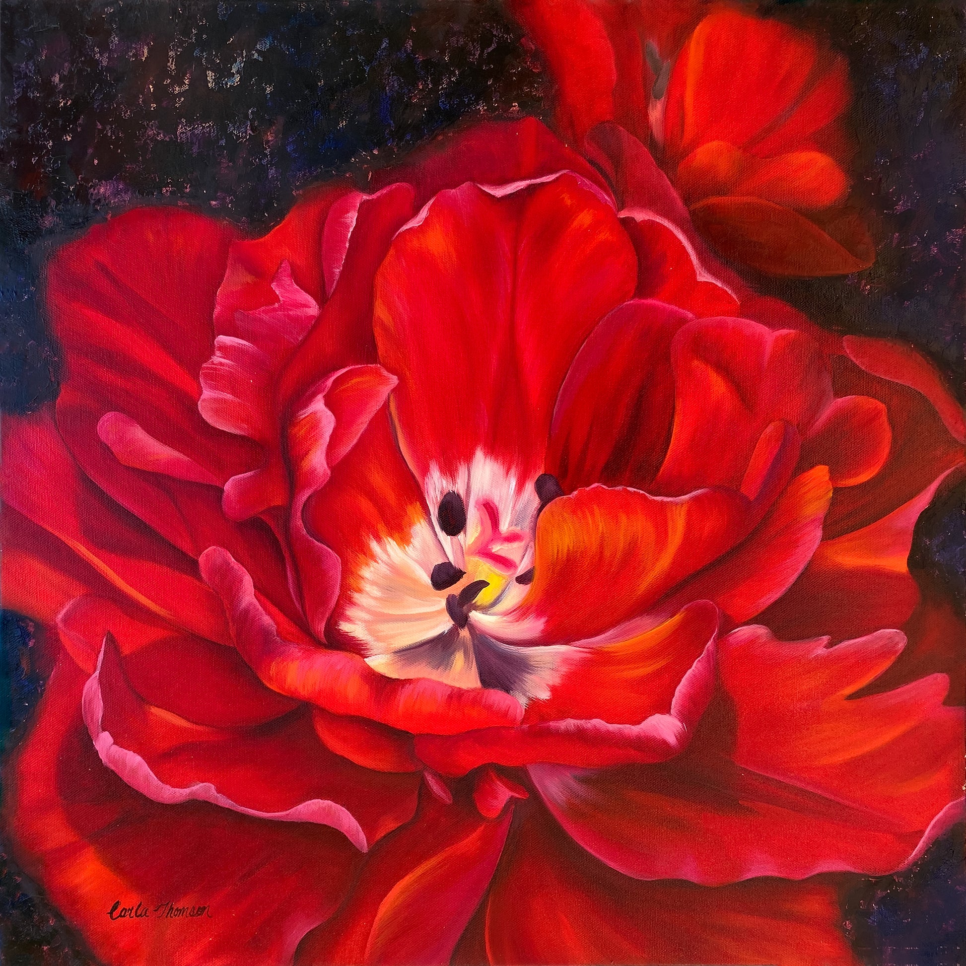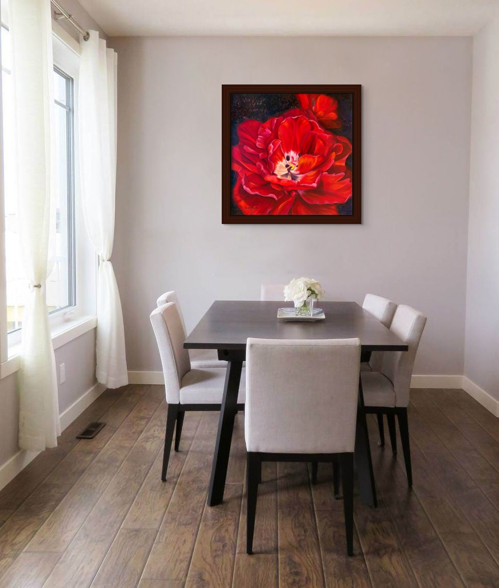 Take a risk and be captivated by the beauty of a Scarlet tulip with this vibrant and powerful oil painting. Capture the essence of adventure with this daring and striking piece.